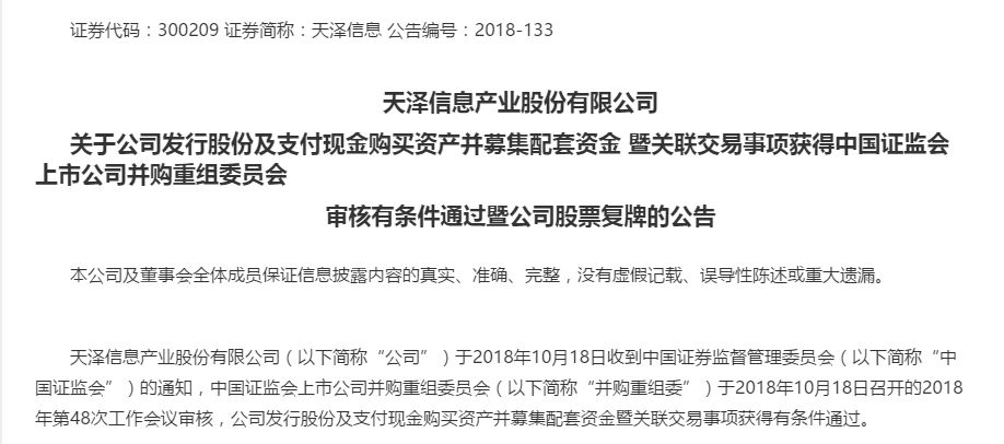 有棵树被天泽信息收购获批公告截图
