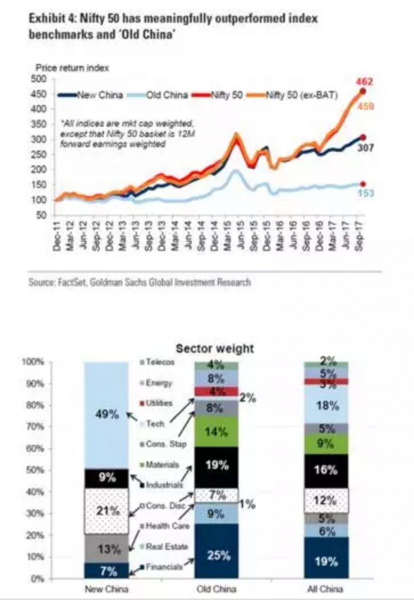 最近高盛做了一个“新旧中国50指数”,在我看来,高盛的选样是有偏的。新的中国漂亮50指数,在海外和A股市场各选25家公司,可能有些代表性公司可能也没有在其中。但是即便是这样并不完全准确的划分,结果也非常惊人。特别是15年股灾发生以后,代表新中国的这些公司,很早就把15年股市泡沫的高点甩在身后,表现得强劲,远远地创出了历史的新高。而代表中国传统经济的指数下跌后一直停留在低点。高盛所选择的新的中国漂亮50成分股中,49%是科技,21%对应的是消费升级,金融只在7%;在传统中国这个指数中,金融占25%, 重工业19%,能源8%,科技仅占2%。这就是分化。新旧动能的转换重塑了经济的韧性。